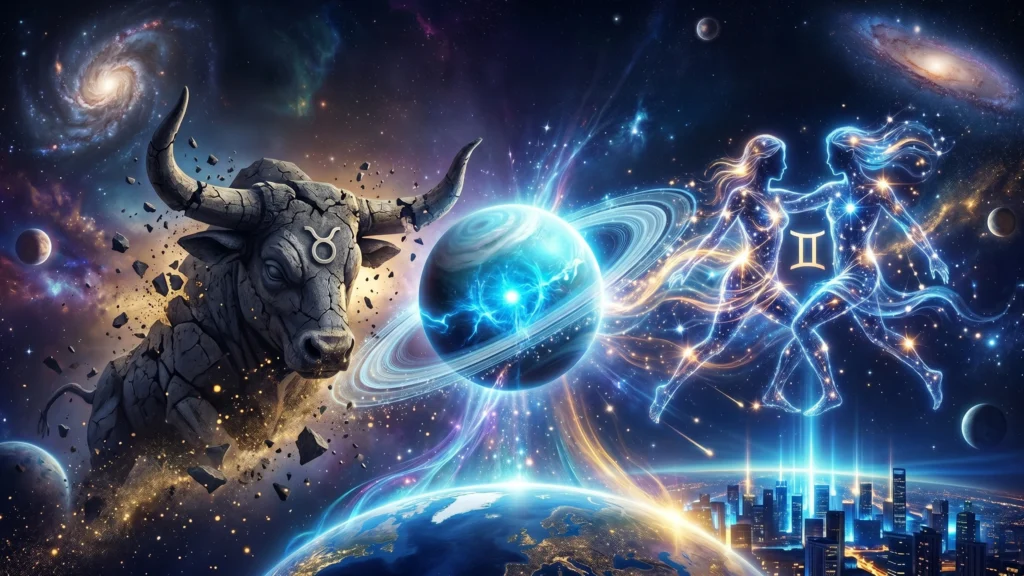 Uranus verlässt am 25. April 2026 um 21:36 Wiener Zeit das Zeichen Stier und tritt in das Zeichen Zwillinge ein. Die siebenjährige Revolution, die seit Mai 2018 die materiellen Grundlagen der Welt erschüttert hat, endet damit endgültig.
