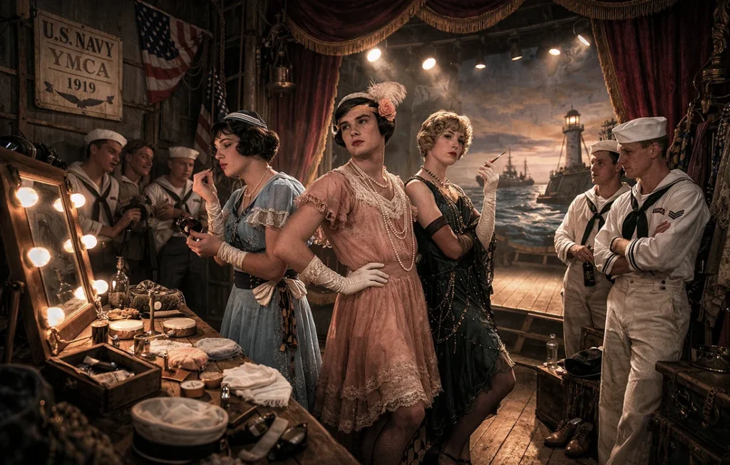 Gleichzeitig förderte die Marine selbst ein kulturelles Paradigma, das die Geschlechtergrenzen verschwimmen ließ. Zur Hebung der Moral, zur Unterhaltung der Truppen und zur Unterstützung der Rekrutierung finanzierte und produzierte das Militär aufwendige Theaterstücke und Musicals. Eines der bekanntesten Beispiele war die Produktion des Musicals Jack and the Beanstalk, die durch Neuengland tourte und ein Orchester mit 25 Mitgliedern sowie eine Besetzung von mehr als 100 Personen umfasste. In diesen Aufführungen traten militärische Rekruten regelmäßig als Frauen in Drag-Rollen auf. Obwohl eine solche Form des Transvestismus damals in der Mainstreamkultur als „niedrige Komödie“ galt – als harmloses Phänomen, bei dem als Frauen verkleidete Männer häufig dem Spott dienten und dadurch paradoxerweise Sexismus und patriarchale Normen bestätigten –, erzeugte sie zugleich eine produktive Verwirrung. Für queere Männer im Militär bot dieses institutionell gebilligte Verkleiden einen seltenen legitimen Raum zur Ausdrucksform alternativer geschlechtlicher und sexueller Identitäten unter dem schützenden Deckmantel des militärischen Theaters. Diese Dichotomie – dass der Staat einerseits Drag-Aufführungen fördert und andererseits eine brutale Säuberung von Männern vorbereitet, die außerhalb der Bühne Weiblichkeit ausdrücken – bildet die grundlegende Heuchelei, auf der der kommende Skandal beruht.
