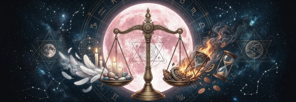 Entscheidungen, die du aufgeschoben hast. Die Waage hat den Ruf der Unentschlossenheit – aber das ist nicht die Wahrheit. Die Waage ist sorgfältig. Die Waage wägt ab. Aber wenn alle Abwägungen abgeschlossen sind, muss die Waage entscheiden. Dieser Vollmond schließt die Abwägungsphase für bestimmte Entscheidungen ab. Es ist Zeit.